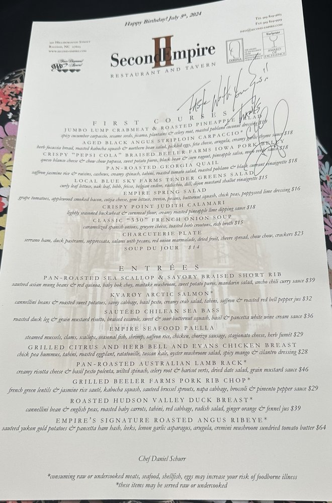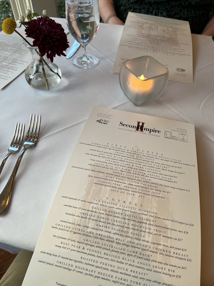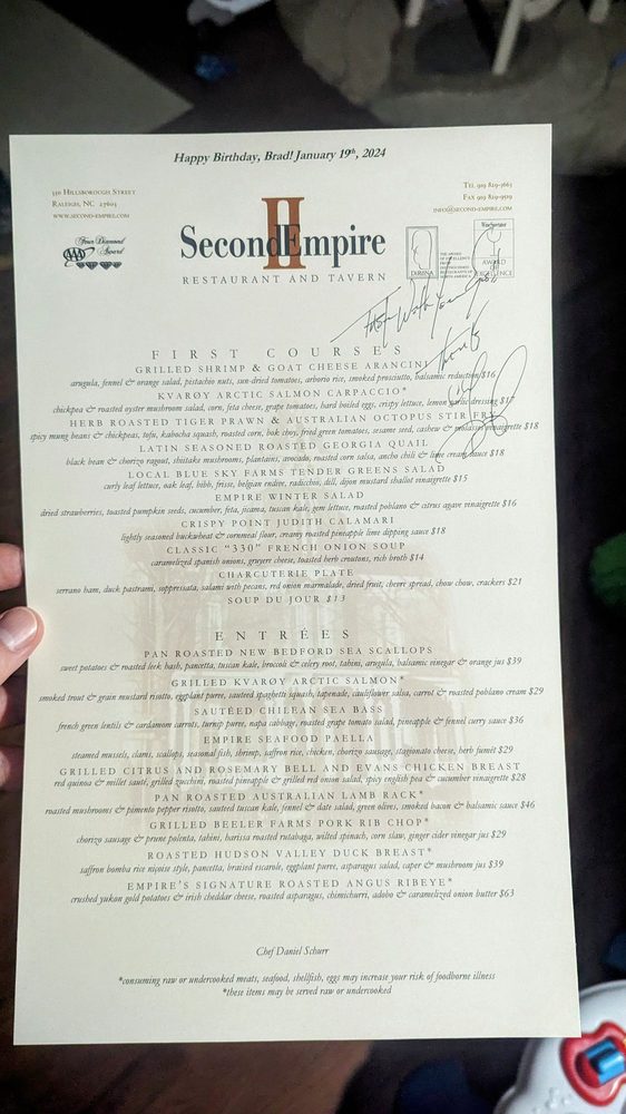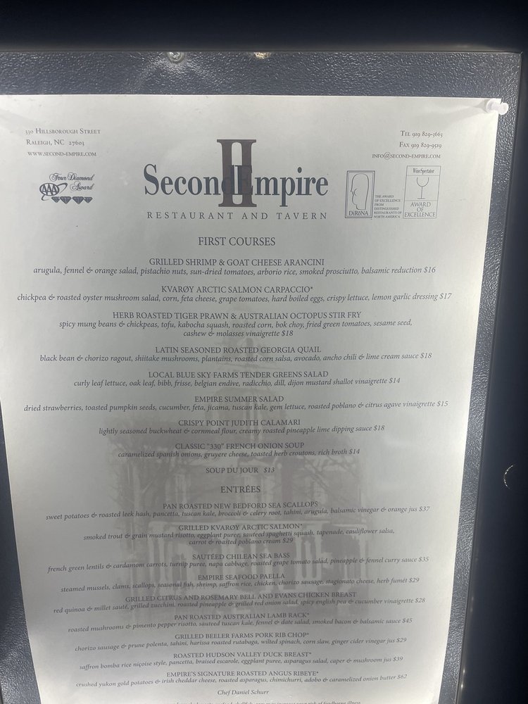Located in Raleigh, NC, Second Empire Restaurant And Tavern is a luxurious and historical dining destination offering New American cuisine. With a romantic and upscale ambiance, it is perfect for special occasions or business dinners. The menu features unique and flavorful dishes, including options for pescatarians and vegans. Customers rave about the top-tier service provided by knowledgeable wait staff, as well as the impeccable presentation of the food. Highlights include the black grouper, lamb chop, sea bass, and morel mushroom appetizer. The attention to detail, from the building's beautiful architecture to the personalized touches like a signed menu for special occasions, sets Second Empire apart. If you're looking for a fine dining experience that exceeds expectations, Second Empire Restaurant And Tavern should be at the top of your list.